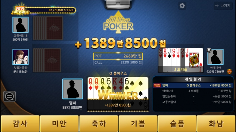테스 올스타포커하다가 오랜만에 뜬 풀하우스! 작성일시 : 2020. 09. 14 (19:15) 조회 : 1,507 / 댓글 : 0 얼마전부터 구글 플레이스토어에서올스타 포커 다운받아서 하는중인데오늘 올스타 포커하다가 오랜만에풀하우스 떴네요ㅋㅋㅋㅋ처음부터 Q 3장들고 시작해서 뭐 하나 뜨겠구나 했더니 풀하우스가 떴네요ㅋㅋㅋ덕분에 돈좀 꽤 벌은ㅋㅋㅋㅋ ㅋㅋㅋ광고영상도 있는데남자분 연기 겁나웃긴ㅋㅋㅋ처음 Q 3장떴을때 절 보는것같네요ㅋㅋㅋㅋ 1추천 글쓰기스크랩 신고