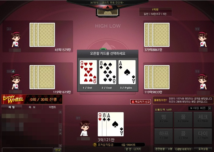 Bonda 윈조이포털에서 하이로우 풀방은 첨인데... 작성일시 : 2020. 09. 16 (16:40) 조회 : 1,373 / 댓글 : 0 윈조이포털에서 하이로우를 플레이하는데보통 3명 아니면 4명이서 하는 경우가 많았거든요이번에 처음으로 한 번 풀방에서 해봤는데영 잡히는 패들이 아슬아슬하더라고요 확실히 1대1이나 소수로 즐기면로우나 하이를 택할 수 있는 선택지가 늘어나서비기는 경우가 종종 발생하는데인원수가 늘어나니 들고있는 카드의 탑이나 아니면 족보를 고려해서 끝까지 밀고가는게 쉽지가 않더라고요하이로우는 역시 깡이 필요한가봐요 1추천 글쓰기스크랩 신고