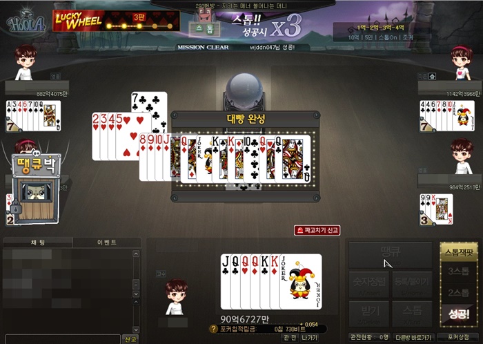 Bonda 윈조이포털에서 훌라를 플레이했는데... 작성일시 : 2020. 09. 25 (15:13) 조회 : 1,336 / 댓글 : 0 J Q Q Q K K 조커윈조이포털에서 훌라를 하는데사실 대빵이란것도 몰랐거든요훌라를하다보니 손에 들고있는 합계가 83점 이상일 때 가능한건데상대방이 버린 카드의 합까지 합쳐서라고 하더라고요처음에 대빵 떙큐가 나왔을 때 땡큐 싸움에서 타이밍을 놓치는 바람에이건 지겠는데 싶었건만...바로 또 Q 한 장을 버릴 줄은 상상도 못했죠 ㅎㅎㅎ덕분에 빠르고 쉽게 이겼다고 합니다 1추천 글쓰기스크랩 신고