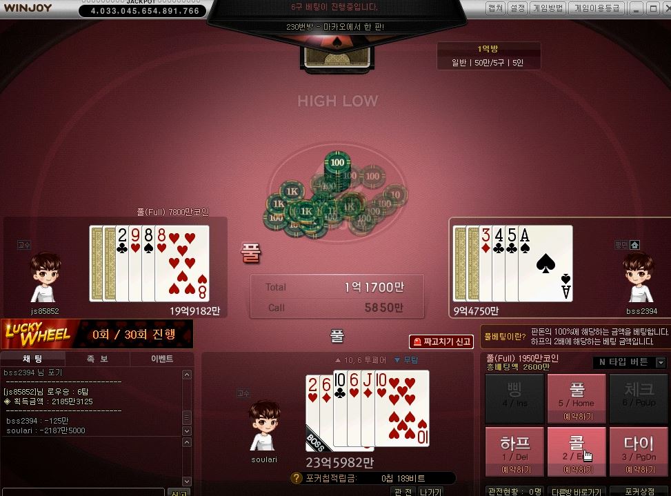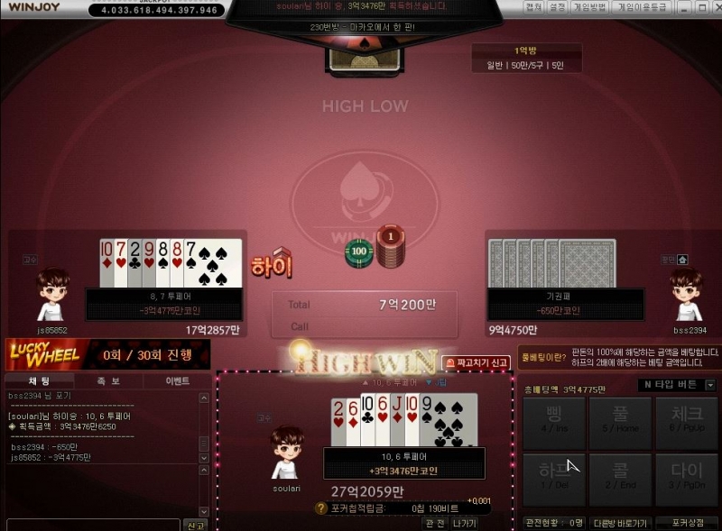 만화부 왠지 하이 할것 같더라니.. 작성일시 : 2020. 10. 14 (16:51) 조회 : 1,395 / 댓글 : 1 윈조이 홈페이지에서 카드게임을 할수 있어서종종 하는 편인데 처음에는 몰랐는데하이로우 이거 은근히 재미있더라고요.전판에서 왼쪽 분한테 로우 했다가 졌는데... 전판 이긴 영향일까요? 풀을 하면 같이 풀하고 하프하면 같이하프를 하면서 끝까지 가더라고요.로우를 할까 하다가 왠지 별거 없는데 하이를 할것 같은 느낌에 하이를 해봤어요.결과는 같은 투페어!그래도 제가 수가 높아서 이긴 ㅋㅋ 1추천 글쓰기스크랩 신고