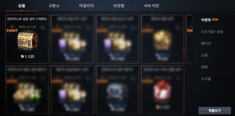 초반에 다이아 상점 들어가서 1125아데나 주고 구매하면 5렙업 구간마다 상자 열 수 있는데