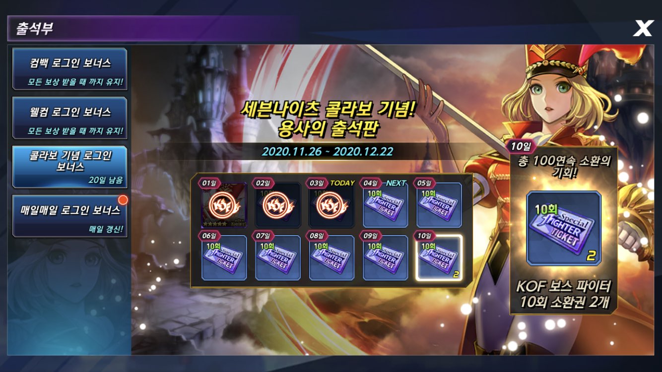 보니까 세븐나이츠 콜라보 출석부까지 진행 중인데 첫날부터 레이첼 받고 시작할 수 있습니다