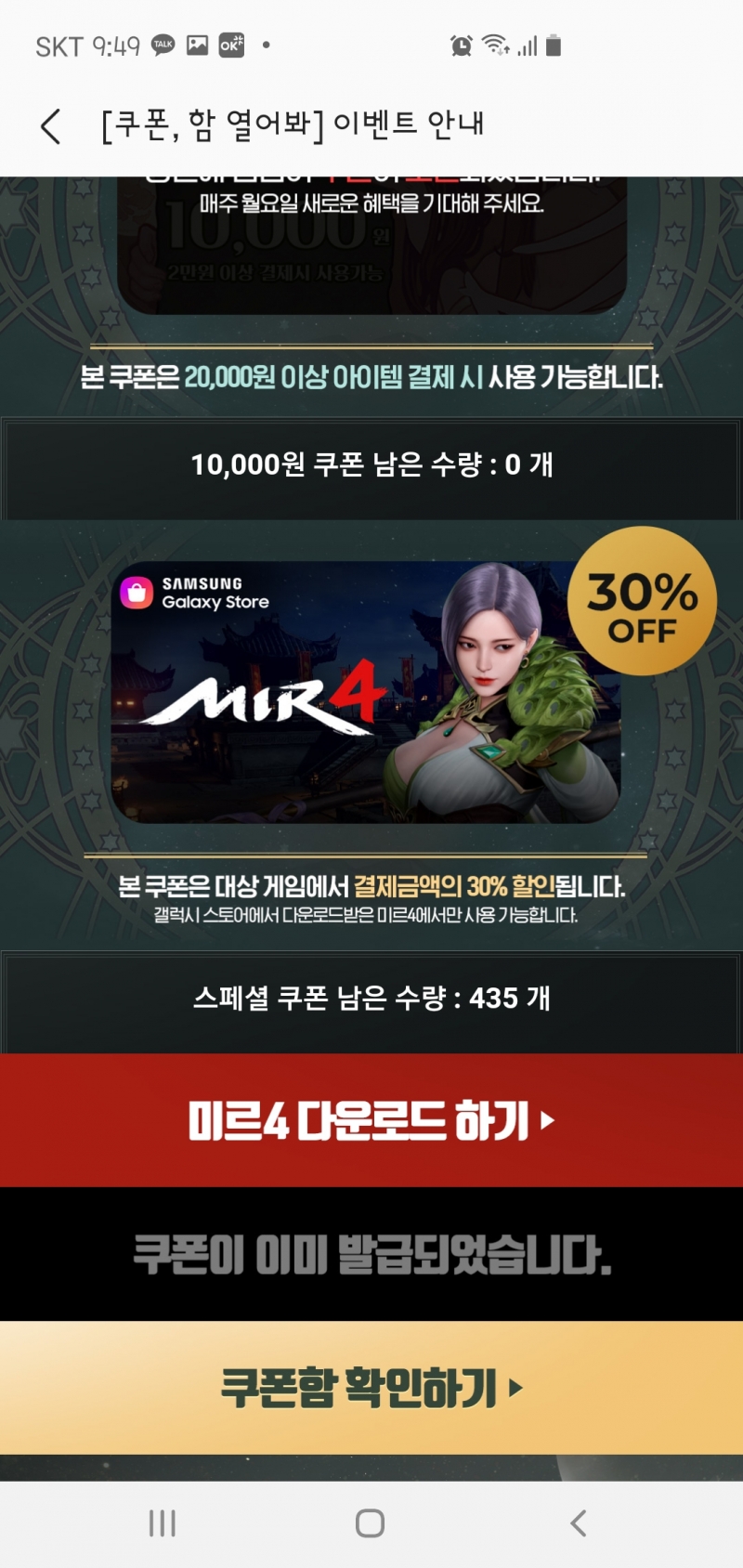 치토스 갤럭시 스토어 쿠폰 꿀 작성일시 : 2020. 12. 08 (16:05) 조회 : 1,794 / 댓글 : 0 갤스 지금 미르4 결제 관련 할인쿠폰 이벤트하고 있는데스페셜 쿠폰같은거랑 여러가지 할인쿠폰들을 뿌려고 있더라고요이왕 미르4 결제해서 플레이하실 분들은 갤스 깔아가지고해보시는거 추천드려용 ㅇㅇ 1추천 글쓰기스크랩 신고