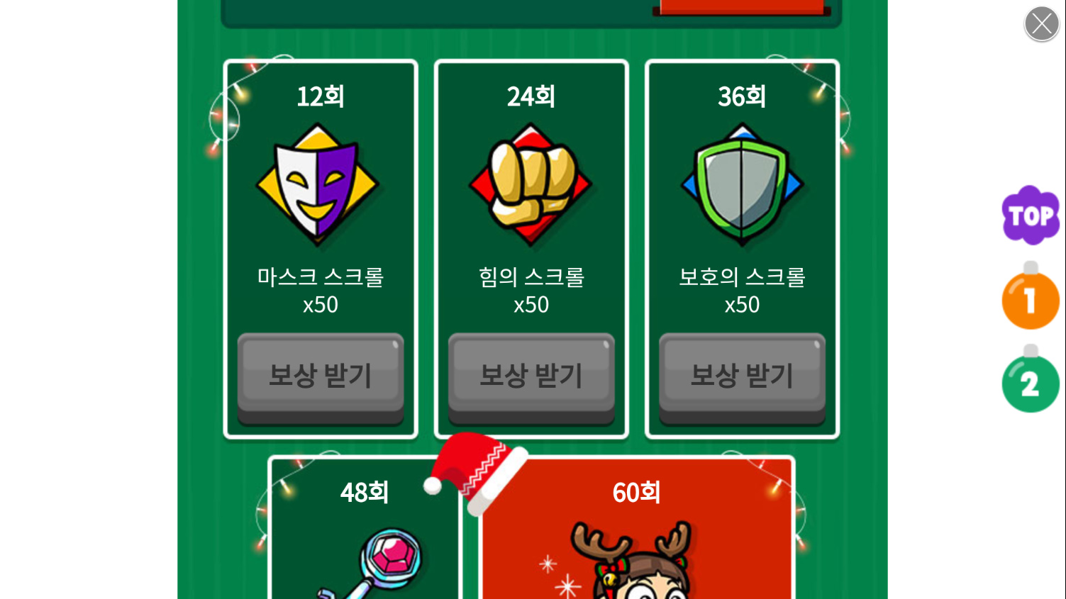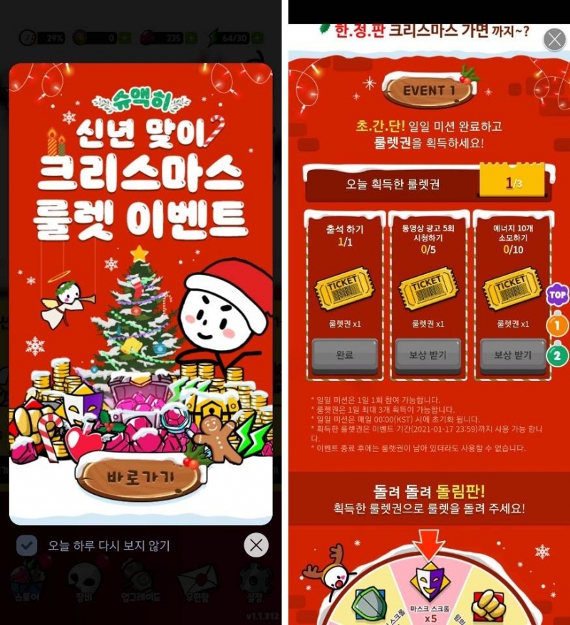 크리스마스 이벤트같은 경우에는 하루에 출석, 광고시청, 체력소모 같은 미션을 성공하면