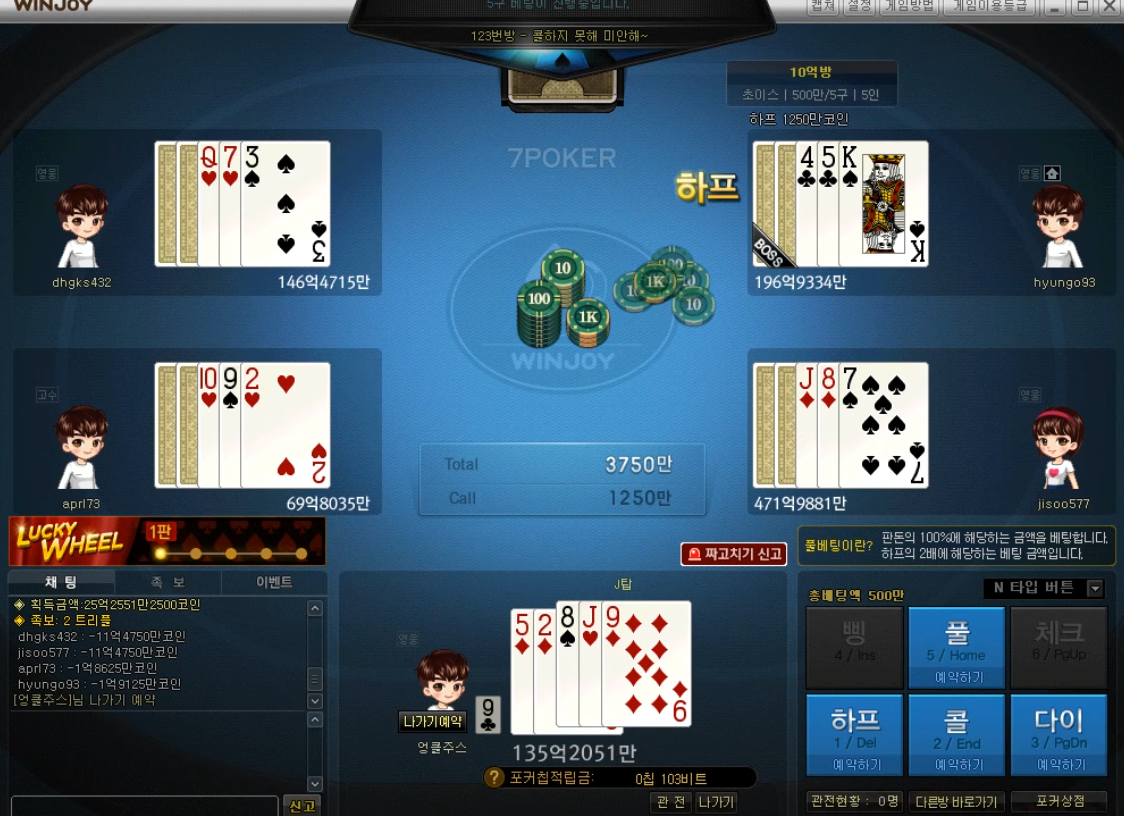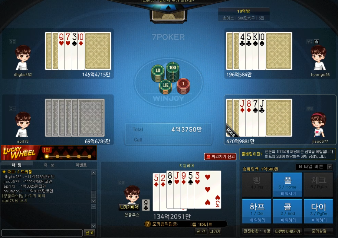 치토스 윈조이 7포커 혹시나 했지만..ㅎ 작성일시 : 2020. 12. 24 (22:20) 조회 : 1,987 / 댓글 : 1 윈조이포털에서 7포커를 쳐봤는데패가 별로 안좋게 잡혔어요...그래도 다이아가 3장에 앞으로 받을 카드가 2장이라혹시나 싶어서 콜하면서 2장 받아봤는데 .. ㅋㅋㅋ 어림도 없지 ..5트리플도 노려볼까 했는데 5는 오른쪽 위엣분이이미 한장 가지고 있더라고요. 일찌감치 다이쳤어야했나 봅니다. 1추천 글쓰기스크랩 신고