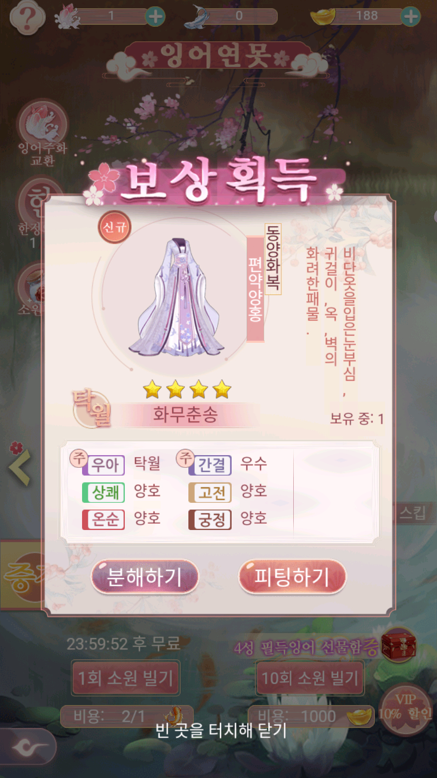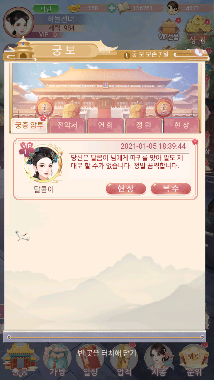 치토스 달을품은꽃 해보신분 ㅋㅋ 작성일시 : 2021. 01. 06 (16:15) 조회 : 1,458 / 댓글 : 0 최근에 궁중로맨스겜 달을품은꽃이라고 신규겜 나왔길래해봤는데 약간 SLG 장르가 가미 된 거 같기도하고 ㅋㅋㅋㅋㅋㅋ 잠깐 종료했다가 접속했더니 다른 유저로부터 궁중 암투를 당한 ; 따귀를 맞아 얼얼해서 당분간 말을 못한다네요ㅋㅋㅋㅋㅋㅋ 가챠 시스템도 잉어 연못에다가 동전 같은거 던져서하고약간 게임이 참신하면서도 재밌네요.간단하게 스토리도 보면서 즐기기 좋은 듯 1추천 글쓰기스크랩 신고