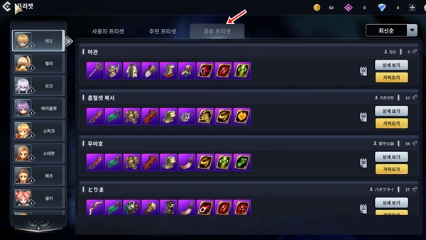준비->공유 프리셋에서 랭커분들의 프리셋을 사전에 가져오면