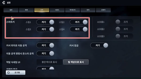 설정-> 조작에 들어가면 스킬 별 스마트 키 설정이 가능