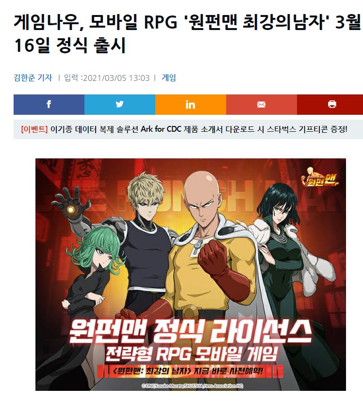 알랑구 원펀맨 출시일 떴네요 작성일시 : 2021. 03. 08 (14:36) 조회 : 1,831 / 댓글 : 0 와...원펀맨 최강의남자 출시일 떴네요....ㄷㄷ16일 출시 .. CBT 못해봐서 진짜 출시만 기다렸는데 대박ㅜㅜ이제 8일만 버티면 원펀맨 할 수 있는거죠ㅜㅜㅜㅜ아 진짜 평 좋아서 너무 기대중인데 ㅜㅜ 설레네요 ㅠ ㅠ 1추천 글쓰기스크랩 신고