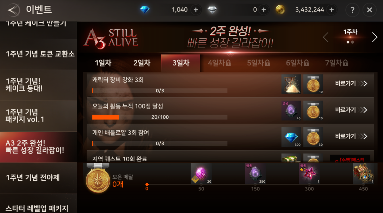 A3 2주 완성 이벤트를 통해서 14일 이벤트 미션 중에 140레벨 전설 아이템을 지급하는 아이템도 있으니
