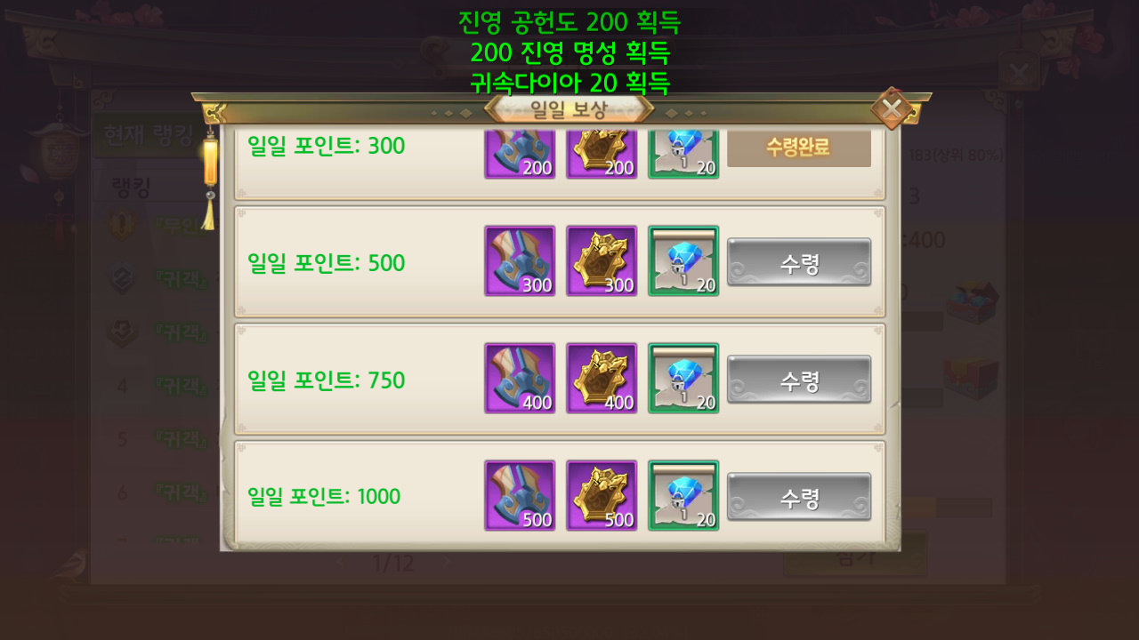 그런데 이렇게 포인트를 모으는 이유는 귀속 다이아랑 진영공헌도를 얻을 수 있어가지구염! 참여하는 재미가 있더라구요.