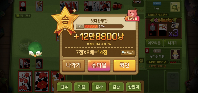 모아모아 시작한지 2일차 시간가는줄 모르겠다 ㅋㅋ 작성일시 : 2021. 04. 08 (11:18) 조회 : 1,981 / 댓글 : 0 명절날때마다 가족들 고스톱 칠 때 어깨너머로 보면서 왜 치나 했었는데 꿀잼이었넼ㅋㅋㅋㅋ 내가 치게 될줄은.. 혹시 피망뉴맞고 같이 치실 분 계신가요? 친추주세여 ㅎㅎ 1추천 글쓰기스크랩 신고