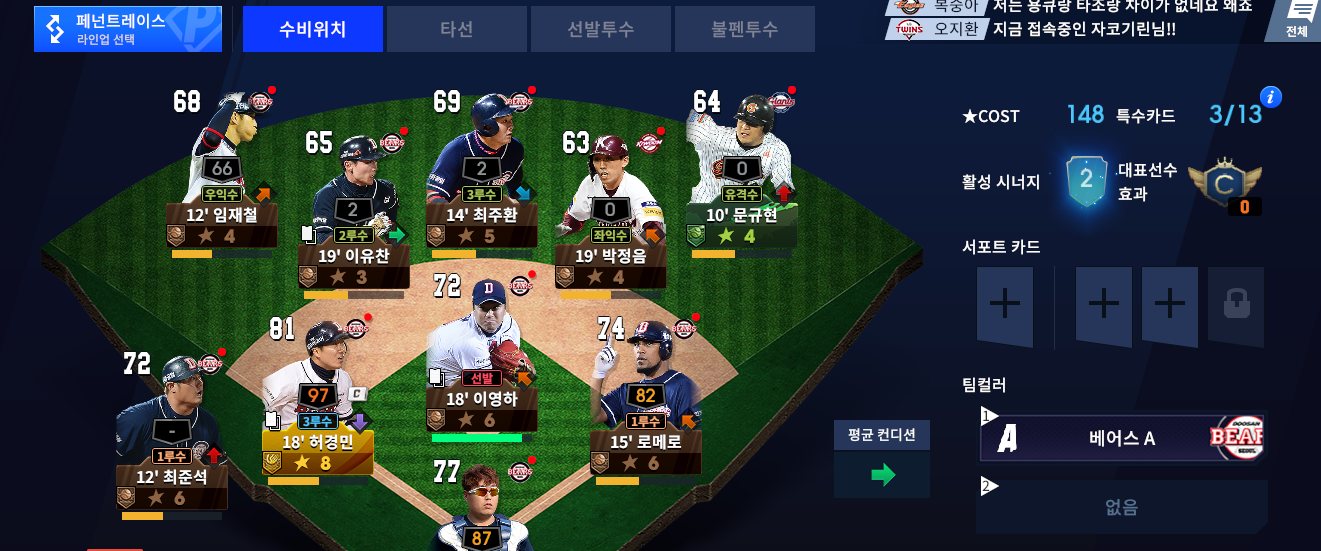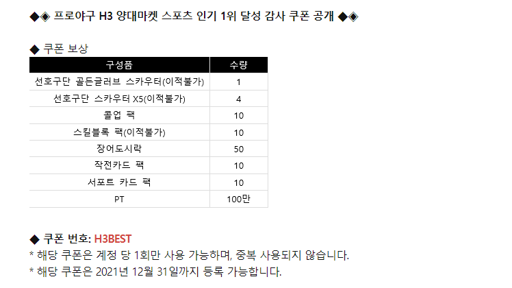웨이 프로야구H3 양대마켓 스포츠 인기1위 달성 작성일시 : 2021. 04. 23 (14:08) 조회 : 1,967 / 댓글 : 1 프로야구H3 이번에 양대마켓 스포츠 인기 게임1위, 구글 스포츠 마켓 매출1위 한기념으로 쿠폰 뿌리고 있습니다.12월31일까지 등록가능하다고 하니 꼭 등록하셔서 아이템 받아가세요. 요즘 프로야구 H3 빠져서 하고 있어요처음에는 가볍게 찍먹해보려고 했는데 운영에 따라서구단 이미지나 선수들 기량이 올라가니 점점 더 몰입해서 하게되는것같아요이제 기초 라인업은 완성시켰으니 골드글러브 선수들로 하나씩 바꿔나가야겠어요 2추천 글쓰기스크랩 신고