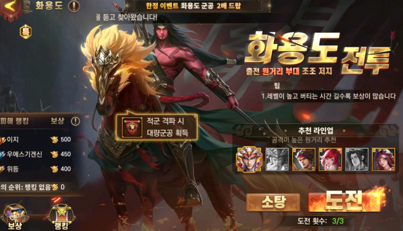 웨이 삼국지 혼 화용도 전투 군공 이벤트 시작했어요. 작성일시 : 2021. 04. 26 (18:30) 조회 : 2,163 / 댓글 : 1 한정이벤트로 화용도 전투군공2배로 드랍하고도전횟수까지 1회 늘어 총3회 도전가능하게 되었습니다.안그래도 레벨 올라가면서 군공부족해서 힘들었는데이번기회에 열심히 모아봐야겠어요 열심히 조조 군사 잡고 있습니다.이번에 황충까지 획득해서 감녕 보연사 소교 등 모두궁수덱으로 만드니 진행이 빠르고 더 많인 진행하는 것 같아요그동안 장수 보족해서 모사도 배치했었는데 이제는 궁수로만 밀어야겠습니다. 3추천 글쓰기스크랩 신고