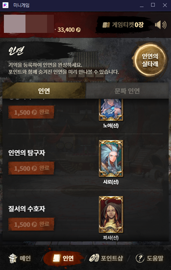 카톡 블소2 미니게임 인연작 끝나가네요 ㅎ 작성일시 : 2021. 05. 17 (14:57) 조회 : 1,560 / 댓글 : 0 1개 ~ 2개짜리는 거의 다 끝난 거 같고이제 난이도 높은 3 ~ 4개 짜리만 끝내면 됩니다 ㅎㅎ카드 뒤집어서 같은 그림 맞추는 미니게임인데하다보면 저렇게 카드를 하나씩 줘요그거로 인연 맞추면 포인트를 받아서 교환할 수 있는 시스템입니다포인트 샵에 영웅 등급까지 뜨는 무기, 방어구 상자가 나와서얘네 둘까진 뽑으려고 열심히 하고 있습니다 3추천 글쓰기스크랩 신고