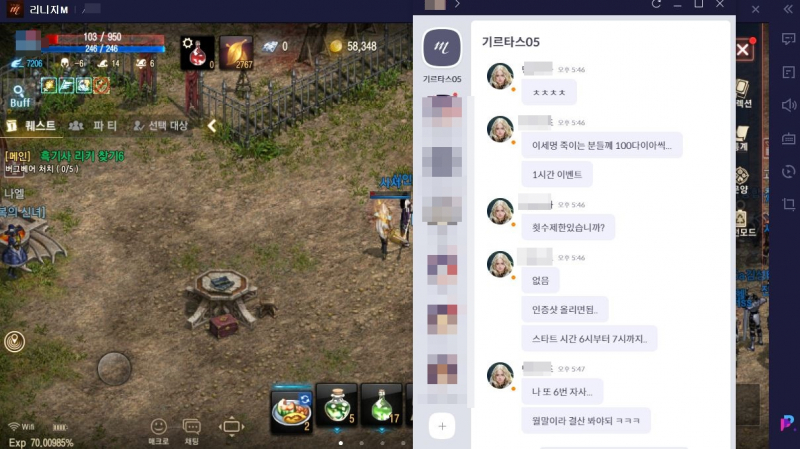 치토스 퍼플 기능이 되게 편하긴해요. 작성일시 : 2021. 07. 01 (18:21) 조회 : 1,003 / 댓글 : 1 최근에 리니지m이 4주년을 맞기도해서 퍼플로 시작했는데 PC 퍼플로 켜서하면 저렇게 깔끔한 메신저로 게임중에 채팅을 퍼플 톡으로 정리해서 볼 수 도 있고무엇보다 채팅을 모바일로 치는게 아니라키보드로 치다보니 확실히 사냥,전투중에도 실컷 수다도 떨거나적 HP상황 브리핑하면서 플레이하기도 좋던..ㅋㅋ뭐 지금 퍼플로 하면 미니게임도 할 수 있으니 퍼플로 한번 해보시길. 3추천 글쓰기스크랩 신고