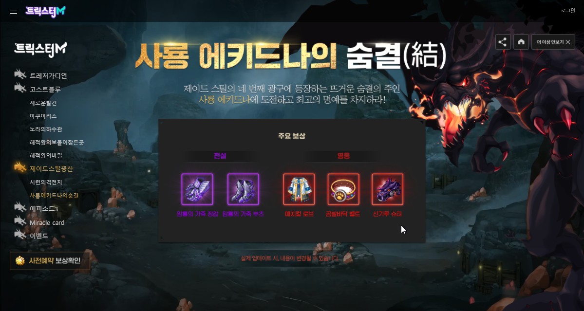 치토스 트릭스터m 대규모 업뎃합니다. 작성일시 : 2021. 07. 08 (19:36) 조회 : 1,005 / 댓글 : 1 지금 트릭스터m 대규모 업데이트 한다고 사전예약 받고 있는데이번에 대규모 업데이트가 되면 고스트 블루 신규 지역이랑총4광구로 이루어진 제이드스틸 광산이 나오거든요.보니까 마지막 4광구에는 사룡 에키드나가 나오는데전설 방어구랑 고고학자 로니 무기인 신기루 슈터도 떨어지는군요.아마 혼탑 7층에 있는 진혼의 수호자랑 비교해서 누가 쎌지도 궁금 ㅋㅋ 3추천 글쓰기스크랩 신고