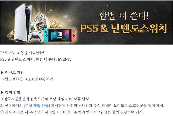 특히 주성 레벨 20이상 달성하고 인증하면 추첨으로 닌텐도 스위치랑 플스5 경품으로 준다고 하는데