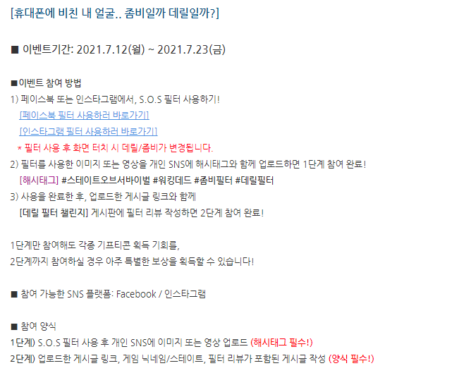 냥펀치 스테이트 오브 서바이벌 이벤트 경품이.. 작성일시 : 2021. 07. 21 (16:15) 조회 : 731 / 댓글 : 1 이번에 워킹데드랑 콜라보하면서데릴 딕슨 영웅도 그냥 뿌리고경품 이벤트같은것도 진행하는 듯 한데...경품이 워킹데드 굿즈 + 데릴 딕슨 피규어네요..ㅠㅠ 한정판이라는데...보니까 SOS필터 사용해서 SNS에 해시태그랑 같이 사진이나 영상 올리고필터 리뷰까지 하면 2단계 완료인듯 한데..왠만하면 사진찍는 이벤트는 참여안하는 편이지만...한정판 데릴 딕슨 피규어는...어쩔수 없음ㅠㅠ 4추천 글쓰기스크랩 신고