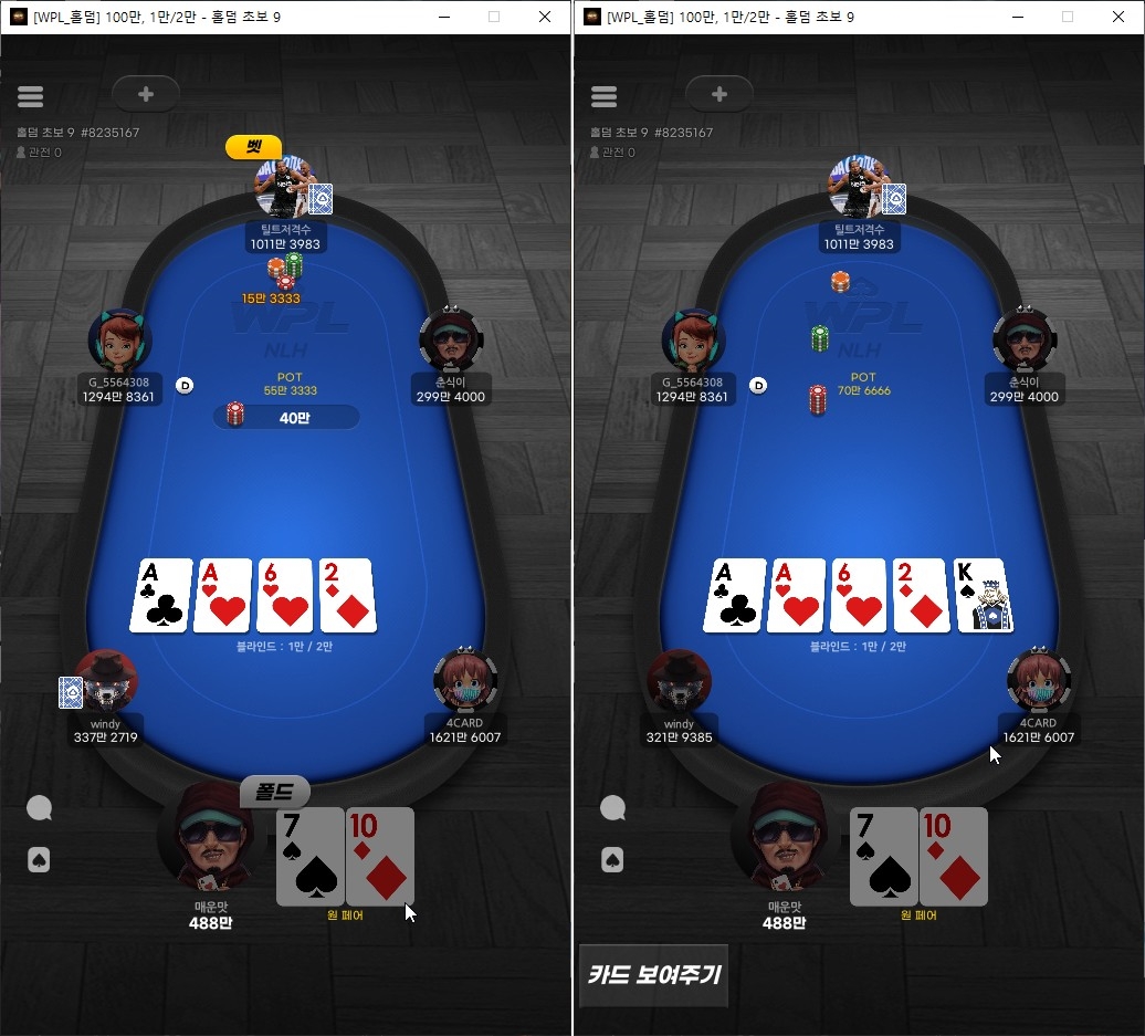 치토스 요새 코로나라 홀덤펍도 못가고.. 작성일시 : 2021. 07. 28 (20:23) 조회 : 740 / 댓글 : 1 코로나가 3단계에서 점점 잠잠해지나 싶었는데요새 또 다시 기승을 부려서 홀덤펍가는건 물거품됐고집에서 WPL로 홀덤 치는데 토너먼트 종류도 많고임요환씨 방송하는거 보면서 치니까 생각보다 재밌.ㅋㅋ이번 판은 한명이 계속 레이즈 달리길래 제 패도 애매하고 낌새가 안좋아서 바로 폴드했네여 4추천 글쓰기스크랩 신고