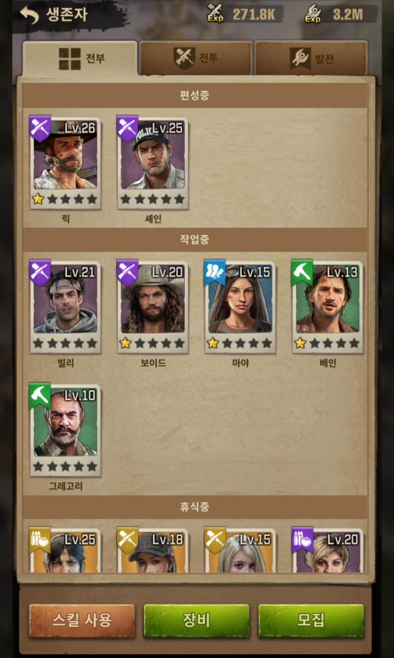 꾸쀼쀼 더 워킹데드: 서바이버즈 국민덱은 역시 작성일시 : 2021. 08. 02 (11:20) 조회 : 1,012 / 댓글 : 2 더 워킹데드: 서바이버즈 드디어 전투력 50만을 넘었다는 소식..ㅋㅋ주말에 심심해서 좀 돌렸는데 이 게임은 조금만 노력해줘도 전투력도 잘 오르고하면 할수록 성취감 같은 게 있어서 더 재밌는 듯해요전략 게임 좋아하는 편도 아닌데 더 워킹데드: 서바이버즈는 중독성 있어요 저는 일단 캐릭터는 이렇게 사용하고 있거든요국민 덱이라고 불리는 릭, 셰인, 보이드를 중심으로 육성 중이에요특히 릭이랑 셰인 같은 경우에는 액티브 스킬도 좋은 캐릭터여서 쓰기 좋아요부가적으로 매기나 로지타까지 써주면 아마 무난하게 하실 듯 4추천 글쓰기스크랩 신고