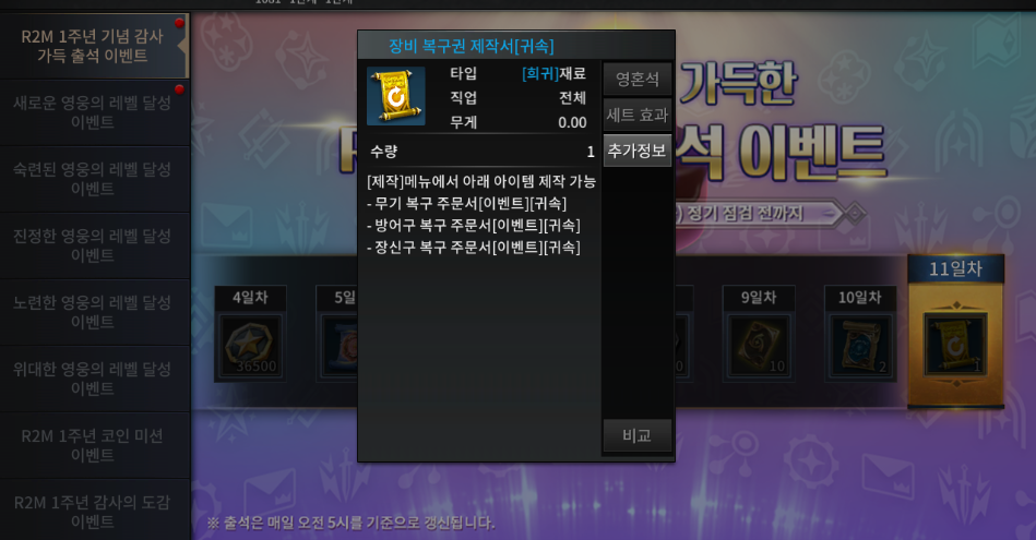 도붸르만 R2M 지금 1주년 이벤트 엄청납니다. 작성일시 : 2021. 08. 29 (02:27) 조회 : 547 / 댓글 : 1 R2M 지금 1주년이라서 이벤트하고 잇는데출석 보상만 챙겨도 진짜 보상 엄청 좋습니다.11일차때 장비 복구권 받는데 이거 말고도소환권부터 골드에 재료들까지 엄청나죠 그래서 간만에 새섭에서 키우고 있는데크 이 1주년 보상템들이랑 밑에 도감미션, 코인미션까지 하면 챙길것도 많고더 재밌게 R2M 할 수 있을거 같아요 ㅎㅎ 3추천 글쓰기스크랩 신고