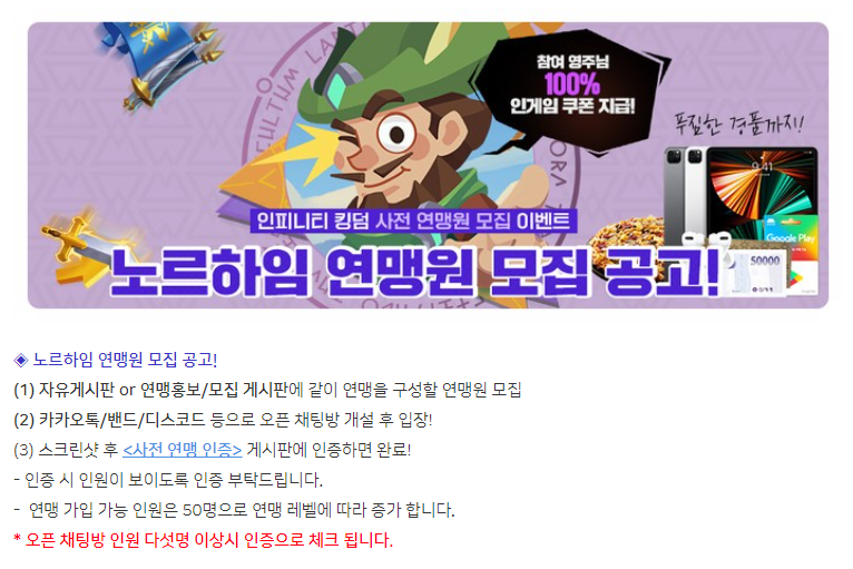 연맹원 사전 공고 + 채팅방 개설 + 인증하면 추가 보상도 노릴 수 있습니다.