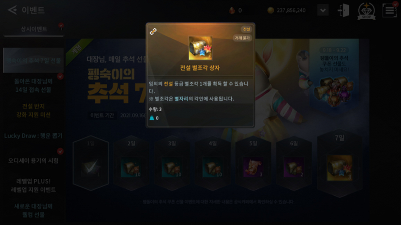 출석부 시작했는데 전설 별조각 받을 수 있으니 추석에 틈틈히 출석해봅니다 ㅋㅋㅋ