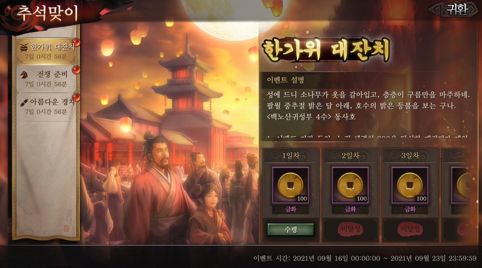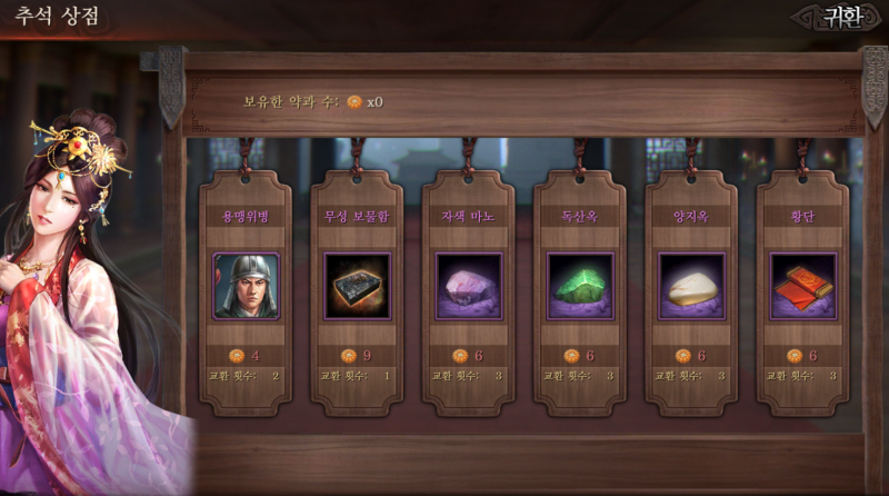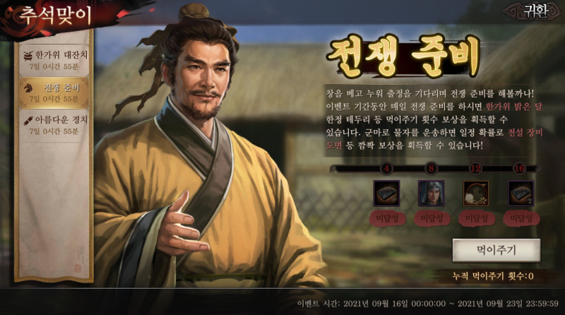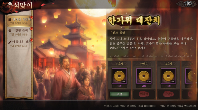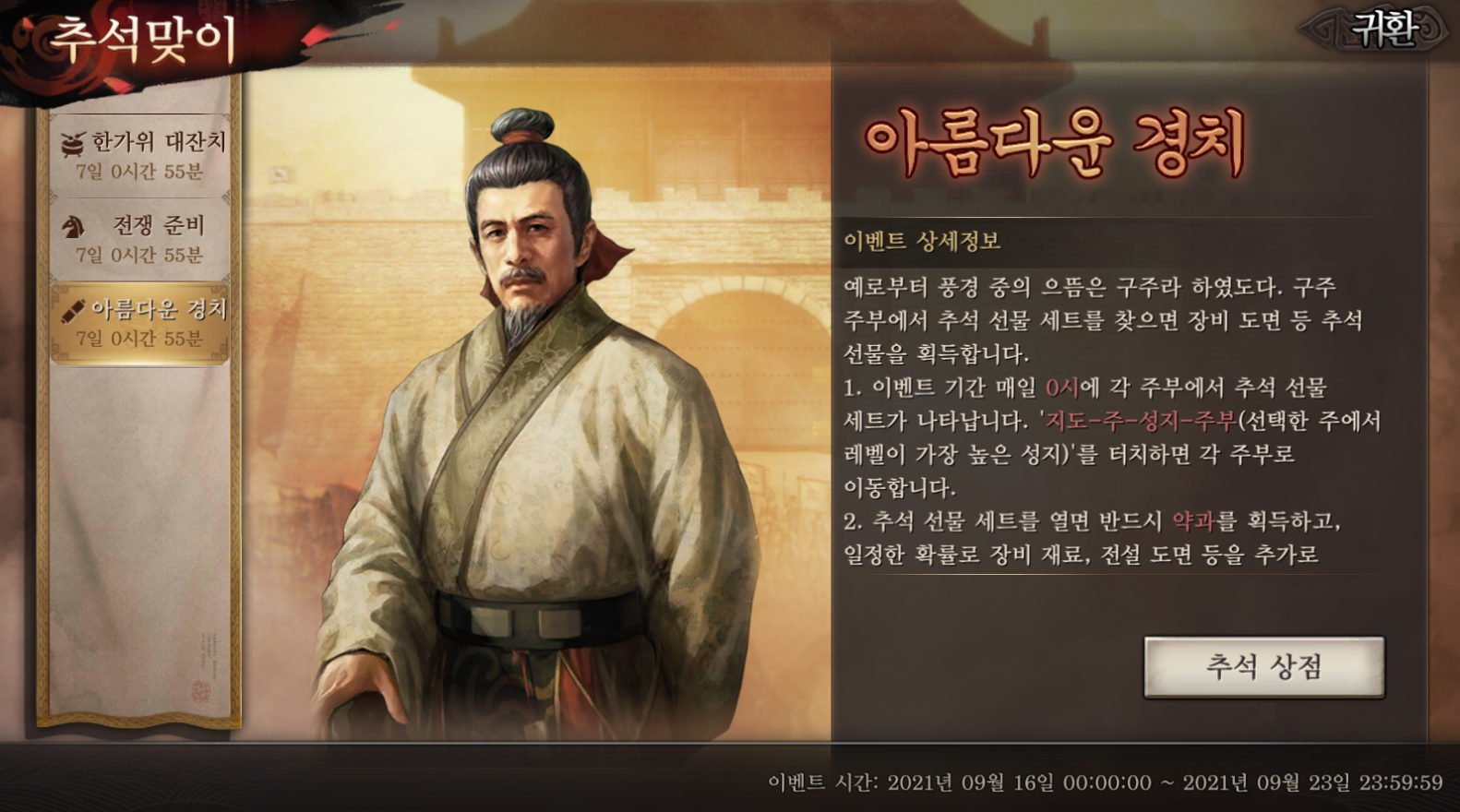 스핏60 삼국지 전략판 추석맞이 이벤트가 진행중이네요 작성일시 : 2021. 09. 17 (10:25) 조회 : 854 / 댓글 : 0 삼국지 전략판에서 어제부터 추석맞이 이벤트를 진행하고 있네요총 3가지가 있는데 출석, 추석 선물 세트 찾기, 말먹이 주기이렇게 있어서 참여하기 쉽네요특히 출석으로 금화를 꼬박꼬박 챙길 수 있는 게 제일 좋아요 ㅋㅋㅋ추석 선물 세트론 전설 도면을 주니까 꼭 하는 게 좋고요그리고 추석 상점이 따로 열렸는데여기서 장비 재료나 4성 장수 재료를 얻을 수 있네요특히 자색 마노, 독산옥 같은 고급 장비 재료를얻을 수 있는 게 매력적이라1순위로 가져가는 게 좋다고 봐요 3추천 글쓰기스크랩 신고