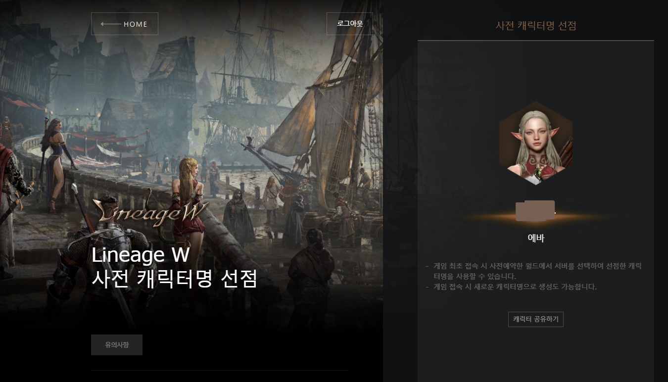 저는 사전 캐릭터명 선점 시작하자마자 에바서버에 생성해뒀는데