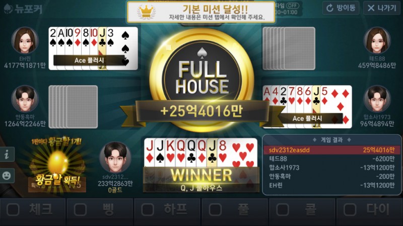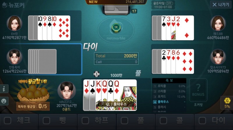 배고픈공룡 야무지게 한판 이겼습니다. 작성일시 : 2018. 06. 05 (18:43) 조회 : 2,279 / 댓글 : 0 오늘 오전에 다 출장나가고 혼자 사무실에서 업무도 급한거 없고해서스마트폰으로 넷마블뉴포커 한판 돌려봤는데시작부터 Q, J 풀하우스가 떠버리더려서 배팅을 풀로 달려봤습니다. 끝까지 베팅액을 조금 올릴려고 했는데 한분이 콜 사인을 주셔서배팅액을 많이 못올린 것이 조금 아쉬웠습니다.그래도 끝까지 남은 분들이 저보다 족보가 다 낮아서 한판 크게 이겼네요. 4추천 글쓰기스크랩 신고