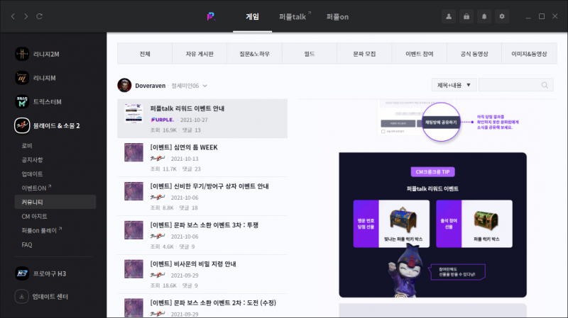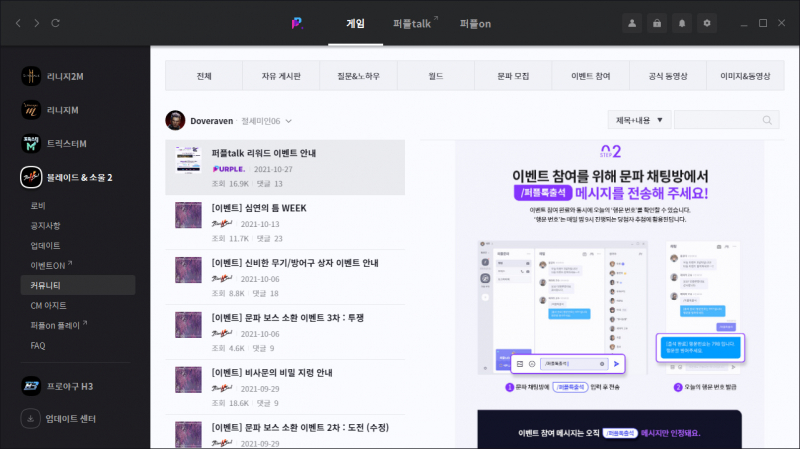 도붸르만 퍼플톡 이벤트까지 있는 블소2 작성일시 : 2021. 11. 08 (18:09) 조회 : 752 / 댓글 : 1 그냥 블소2할떄 퍼플로 하고 있고또 퍼플로 하게되면 자연스럽게 퍼플톡을 쓰게 되는데이번에 문파 참여 이벤트가 있더라구요?블소2에 문파톡방에다가/퍼플톡출석 이라고 치면은 이벤트가 참여 되는데 참여보상도 있고 행운번호 받아서 매일 오후9시에 발표하는 추첨 보상까지 있으니문파원들 전부 참여해서 최대한 보상 많이 받으시길 바랍니다 ㅎㅎ 2추천 글쓰기스크랩 신고