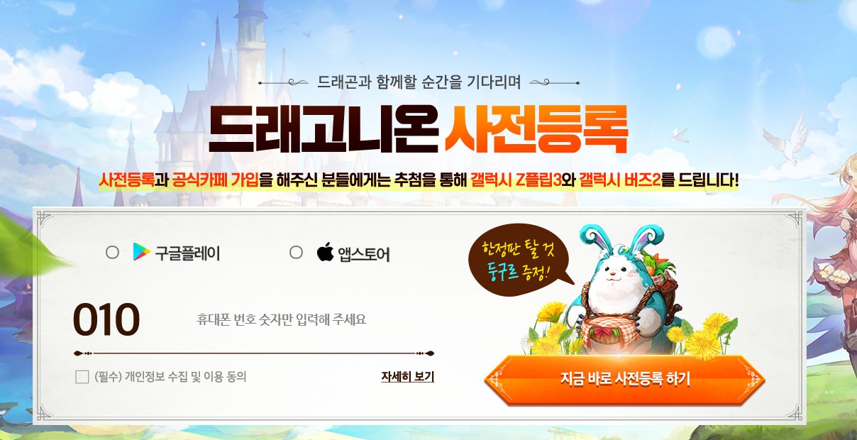 n210084995 드래고니온 사전예약들 하셨나요?! 작성일시 : 2021. 11. 22 (14:31) 조회 : 516 / 댓글 : 0 드래고니온 사전예약들 하셨나요???지금 사전예약 하시면 탈 것 둥구르는 100% 준다고하네요Z플립3은 추첨을 통해서 준다하고 공식커뮤니티 사이트에 가입하면버즈2 추첨을 통해서 준다고하니 한번 노려볼만하네요세계관도 괜찮아 보이고 콘텐츠도 재밌어 보이네요!다들 사전예약들 해보셔요 2추천 글쓰기스크랩 신고