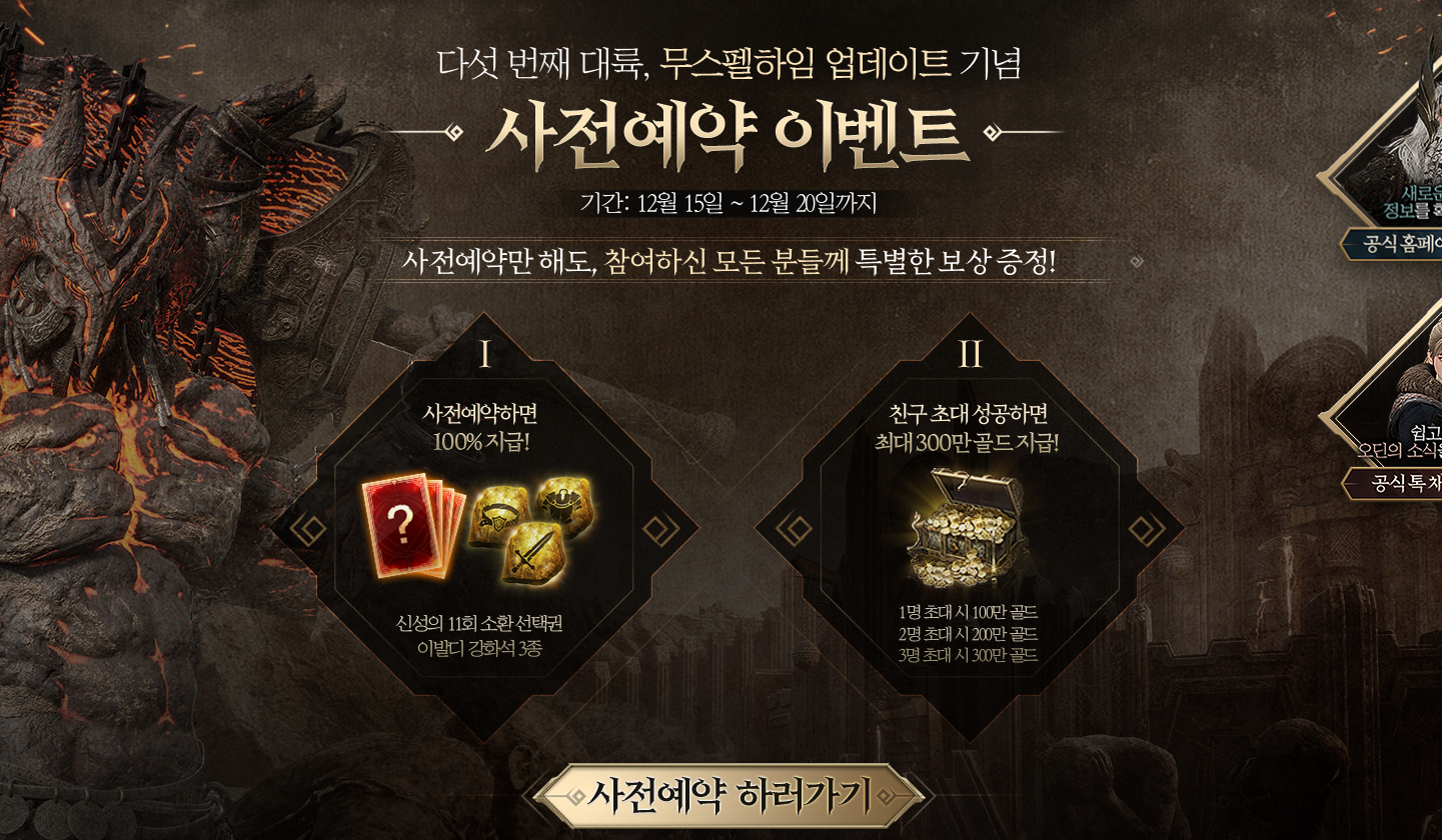 도붸르만 오딘에 드디어 5챕터 무스펠하임이 나옵니다 작성일시 : 2021. 12. 20 (15:58) 조회 : 773 / 댓글 : 1 북유럽 신화에서 세상의 끝이라 불리는무스펠하임이 오딘 5챕터 신규 지역으로 나옵니다.이전에도 공개 했었지만드디어 사전예약을 하고 있어서 바로 신청해놨죠 기본적인 사전 이벤트 보상으로 산성의 11회 소환 선택권에이발디 강화석 3종에 친구초대시 최대 300만 골드까지꽤나 푸짐해서 꼭 신청해두시길 바랍니다.이 밖에도 인게임 보상도 있으니 접속까지 하면서 기다리면 좋겠죠? 1추천 글쓰기스크랩 신고
