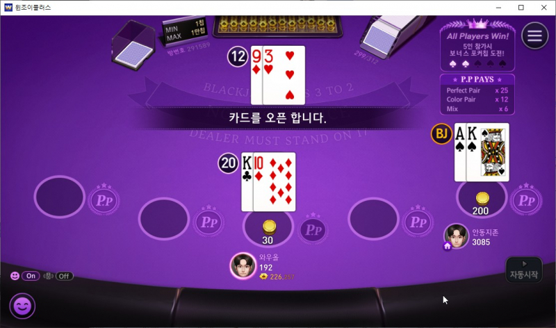 치토스 오늘의 블랙잭 작성일시 : 2022. 01. 20 (13:01) 조회 : 542 / 댓글 : 2 잠깐 블랙잭 몇판 칠 정도의 짬이나서윈조이플러스 들어가서 블랙잭 들이대 봤는데옆에분 바로 21띄우고 저도 20이라 스탠드하면이거 그냥 따는판이다 싶었는데 이거 딜러까지 20이 나와버리네여 ㅋㅋㅋㅋㅋㅋ첫판부터 신경전이 장난 없구만유 1추천 글쓰기스크랩 신고
