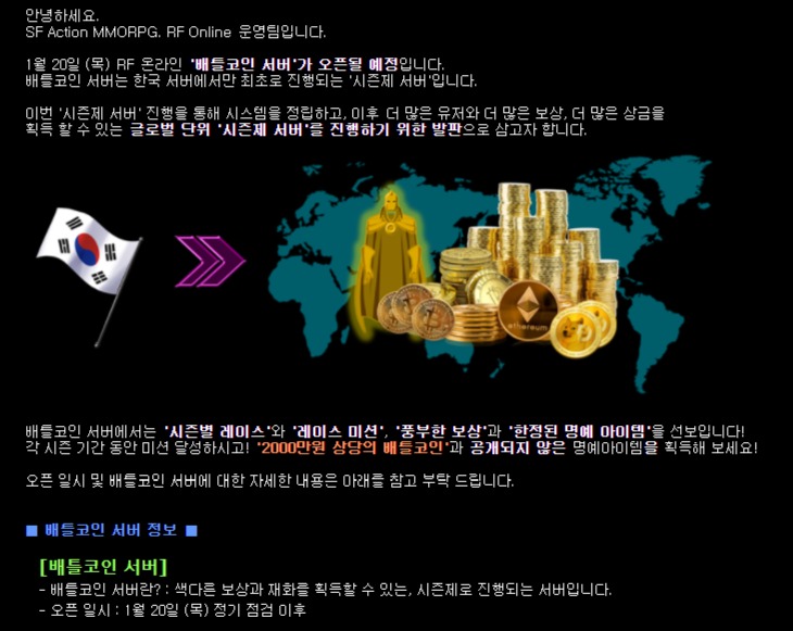 치토스 RF 온라인 배틀코인서버 육성중 작성일시 : 2022. 01. 21 (19:24) 조회 : 604 / 댓글 : 2 RF 온라인 배틀코인서버가 어제부터 오픈했거든요이 서버가 특이한게 시즌제로 운영되는데 보상으로총 2천만원 상당의 배틀코인을 줍니다. 저도 원래 기존섭 키우던 캐릭이 있었지만 이번에 배틀 코인 서버가 오픈되서 새로 시작해봤는데 퀘스트 같은거 잘 따라가니까 업도 금방되고 좋던ㅋㅋ 2추천 글쓰기스크랩 신고