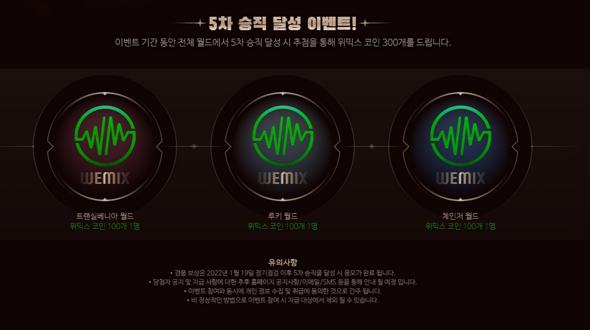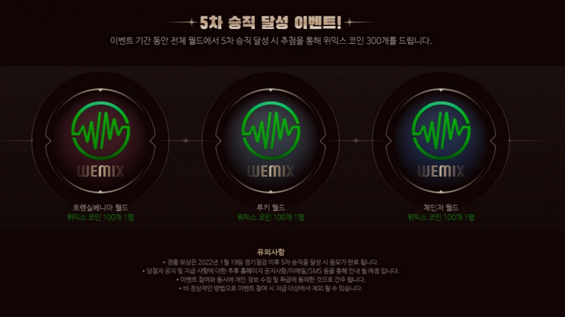3월 16일까지 진행되며 블리츠 서버를 제외한 모든 월드에서 5차승직을 달성하면 추첨을 통해 위믹스 코인 300개를 준다고 합니다!