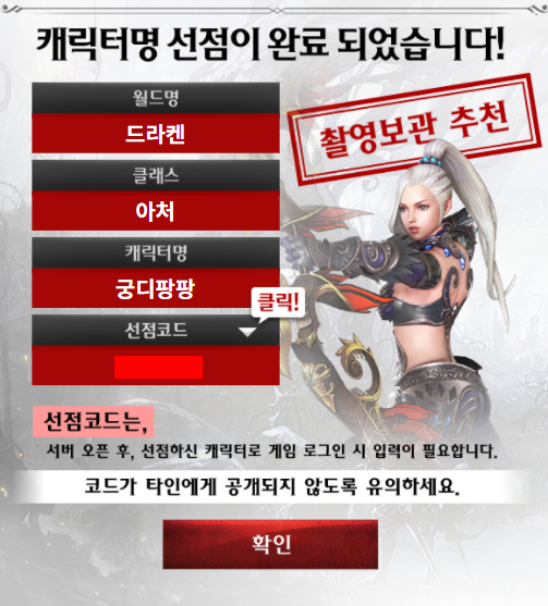 캐릭터명 선점시 선점코드를 받게되는데 서버 오픈후