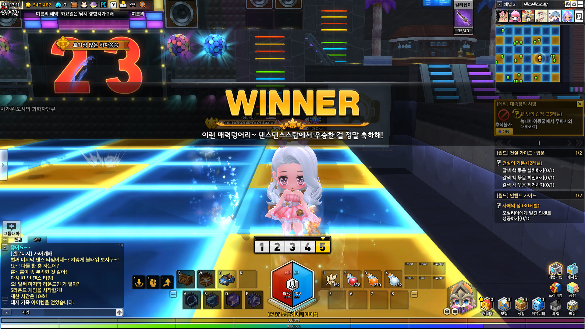 춤추고 인원에 맞춰서 칸에 들어가면 성공! 5번 통과하게되면 우승하게되고 경험치를 줍니다.