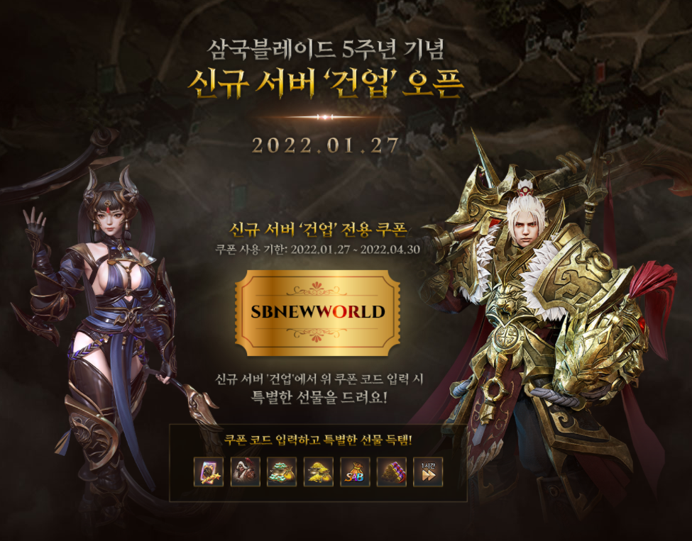 n165455765 삼블 쿠폰 쓰세여!! 작성일시 : 2022. 02. 17 (17:26) 조회 : 497 / 댓글 : 0 삼국블레이드 하시는 분 있나요!?!지금 5주년 이벤트 진행중입니다ㅋㅋㅋ그 중 가장 좋은 건 역시 이 쿠폰이 아닐까 싶어요.이번에 5주년 업뎃하면서 신썹 건업 생겼는데쿠폰도 주더라고요!!저도 이번 기회에 건업에서 새로 시작했습니다 ㅋㅋㅋ쿠폰 쓰고 달리니까 너무 재밌네요 1추천 글쓰기스크랩 신고