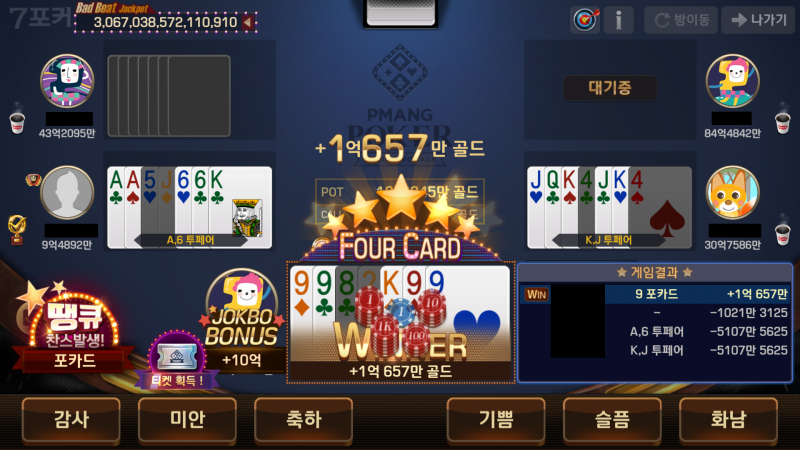 MIRATK 우와... 포카드 나온 거 처음 봐요 작성일시 : 2022. 03. 07 (16:50) 조회 : 575 / 댓글 : 0 얻은 금액은 적긴한데 그동안 피망포커 할 때 평범한 우승만 해봤지 이런 화려한? 우승은 처음 해보네요 ㅋㅋ 마치 스포트라이트가 비춰진 느낌... 너무 기분 좋네요~~! 1추천 글쓰기스크랩 신고