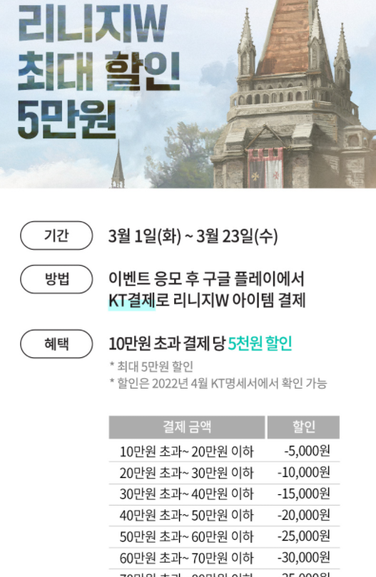 도붸르만 KT에서 리니지W 아이템 결제 할인해주네요 작성일시 : 2022. 03. 16 (18:07) 조회 : 652 / 댓글 : 0 KT에서 리니지W 아이템 결제하면10만원 초과 결제당 5천원씩 할인 해주네요.참고로 KT결제로 해야하니까 꼭 참고하시고또 이벤트 응모 기간에 응모를 해놔야 하니미리미리 해놓으시길 바랍니다.참 KT가 이런 할인 이벤트 잘해줘서 좋은거 같아요 2추천 글쓰기스크랩 신고