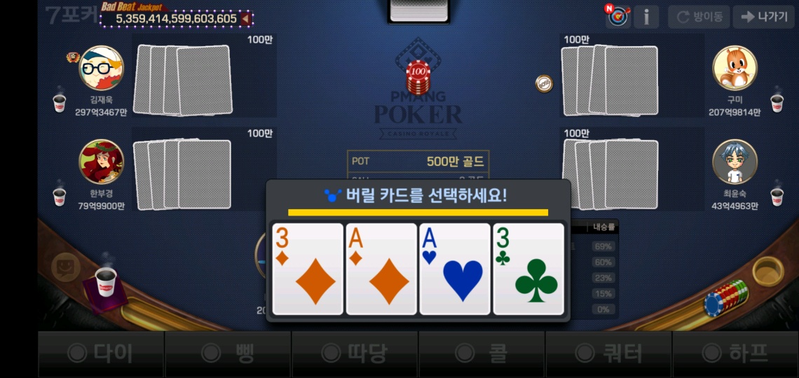 n165455765 시작이 좋아~ 작성일시 : 2022. 03. 18 (14:06) 조회 : 421 / 댓글 : 0 피망포커 하면서 가장 기분 좋을 때 ㅋㅋㅋㅋㅋㅋ첫 받은 4장 패 중에 이렇게 원페어씩 나와주면 뭐 버릴지 행복한 고민 하게 됨 ㅎ물론 3클로버 버리고 A트리플로 이김 1추천 글쓰기스크랩 신고