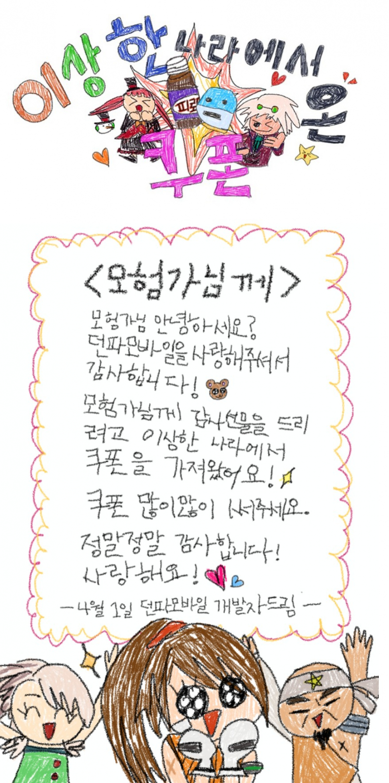치토스 던파 모바일 만우절이라곸ㅋㅋ 작성일시 : 2022. 04. 01 (19:26) 조회 : 715 / 댓글 : 1 던파 모바일 4월 1일 만우절이라고 쿠폰을 주는데... 엌ㅋㅋㅋㅋㅋㅋㅋㅋㅋㅋㅋㅋㅋ아니 대충 그린거 같으면서 뭔가 묘하게특색표현 진짜 잘한거 같은.. 안그래도 요즘 던파 모바일 한창 친구들이랑같이 육성하면서 레벨 경쟁하고 있는데 요즘 제가 일이 바빠서많이 뒤쳐졌거든요 ㅠ 글도 오늘 지나면 주말이니까주말동안 바짝 따라잡아봐야겠군요 2추천 글쓰기스크랩 신고