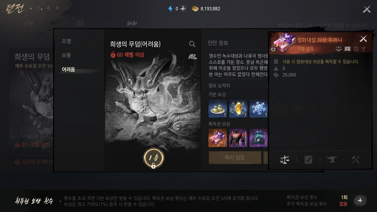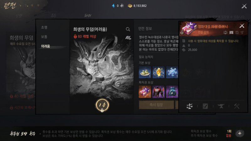 희생의 무덤은 초행, 보통, 어려움 이렇게 구성 되어 있는데 어려움 보상 ㄷㄷ