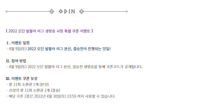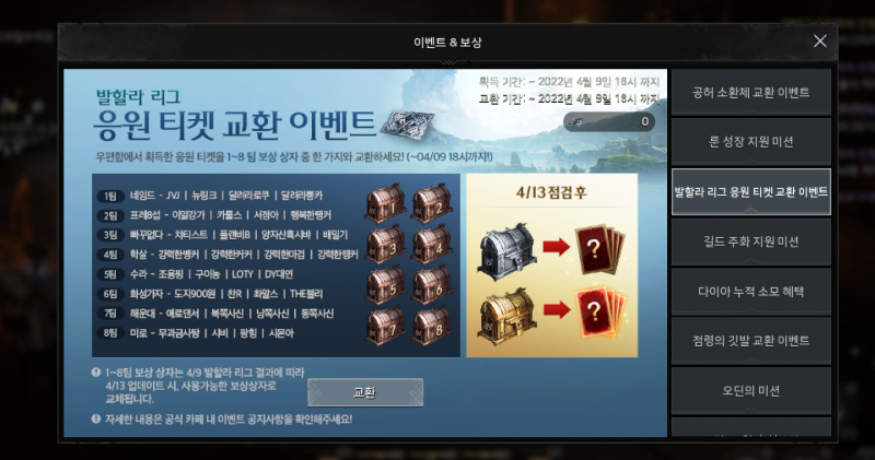 웨이 오딘 발할라 리그 이벤트 참여헀습니다. 작성일시 : 2022. 04. 07 (16:31) 조회 : 685 / 댓글 : 1 오딘 발할라 리그 티켓 교환 이벤트 하고 있어요!본선 진출한 8개팀 중 하나 선택해 응원할 수 있는데찾아보니 4팀과 8팀이 좀 강세라고 해서고민하다가 4팀 선택했어요ㅋㅋㅋ아이디부터 뭔가 한팀 느낌 강하게 나는데제발 우승해서 신성 11회소환권 받았으면 좋겠어요 ㅋㅋㅋ 이번주 토요일 저녁6시에 본선 결승 경기 생방송으로 진행해준다고 하는데요중간중간 특별 시청 쿠폰으로룬. 신성의룬 소환권 뿌려준다고 하니시간되시는 분들은 한번 시청해보세요! 1추천 글쓰기스크랩 신고