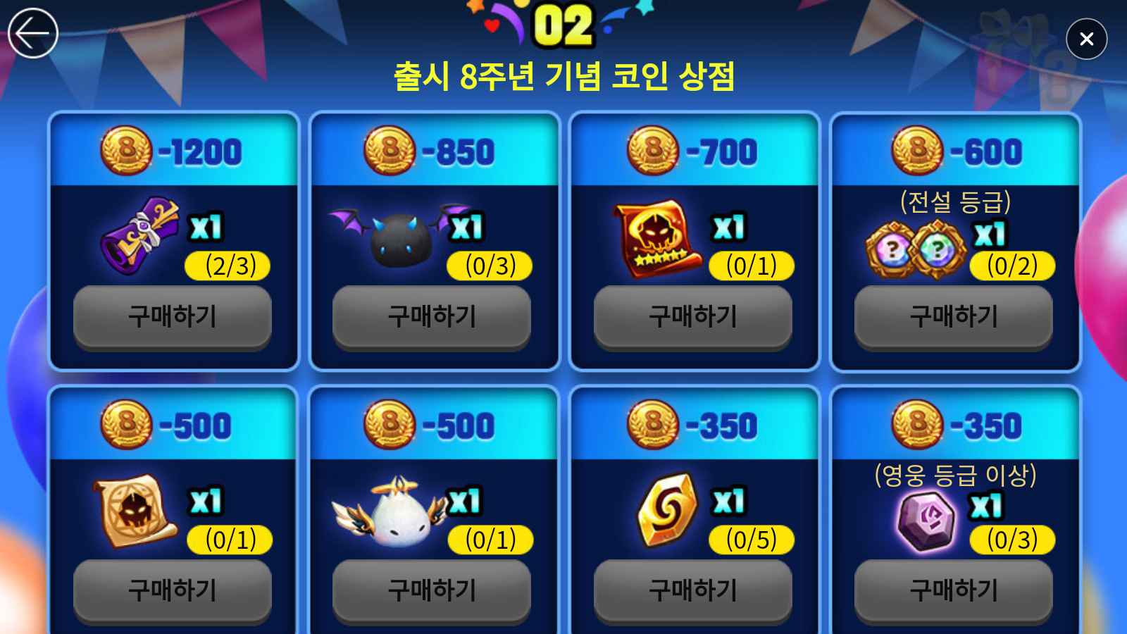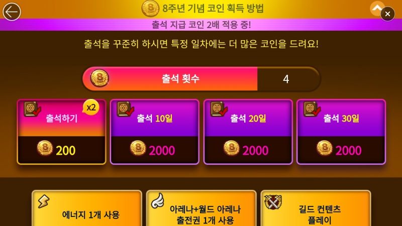 핵심인 8주년 기념 코인은 6가지 방법으로 획득할 수 있는데요.