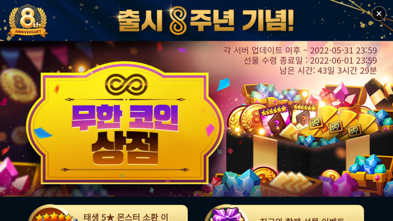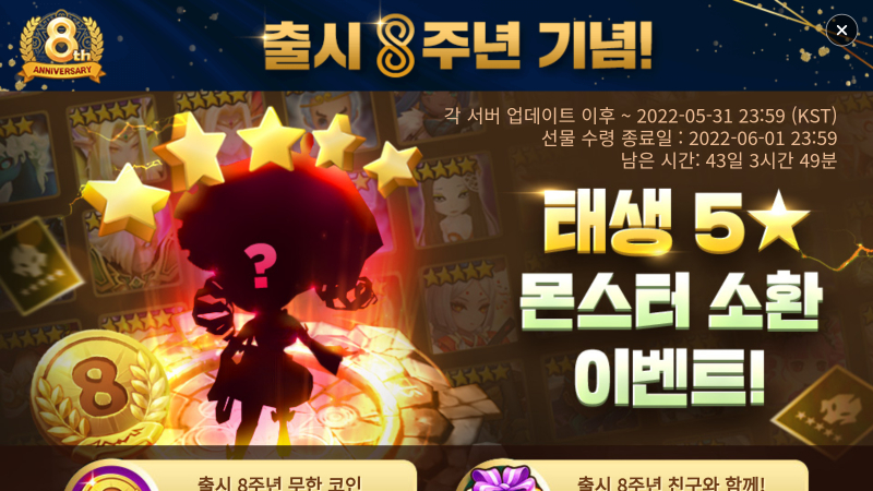 누적으로 8주년 기념 코인을 획득하여, 불, 물, 바람 속성 중 랜덤으로 태생 5성 몬스터를 최대 8번 소환할 수 있습니다.
