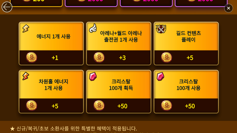 길드 컨텐츠 플레이할 때마다 5개, 차원홀 에너지 1개 사용할 때에 5개,