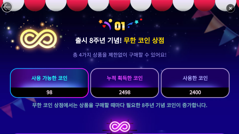 또한 무한 코인 상점도 있어서 원하는 아이템은 구매할 수 있습니다.